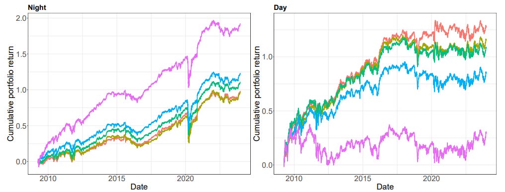 They noticed that stocks with large trading volume just after markets opened were the main driver of the overnight effect. For the uninitiated, trading volumes are heavily concentrated during the last hour of the day. Institutional investors typically want to trade when liquidity is highest which means they tend to wait until the end of a trading day to execute their orders. This becomes a self-fulfilling prophecy. Because big institutions focus their trading on the last hour of the day, this is where volume is highest and this is when other institutions want to trade in the future as well.