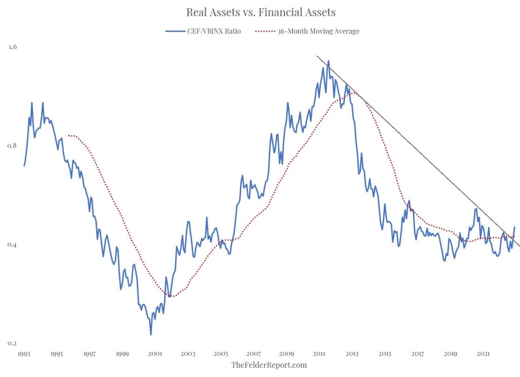 Over the past decade, the trend has favored financial assets but the decade prior to that saw the precious metals outperform dramatically. Today, it looks as if the trend may be shifting in favor of precious metals once again. The ratio has recently climbed back above its 36-month moving average and broken out above its decade-long downtrend line at the same time.