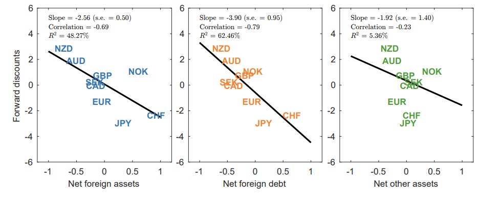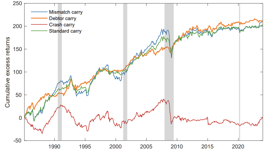 Investors implementing a carry trade typically borrow from countries with net foreign asset and invest in currencies with higher net foreign debt positions. If the economy slows or we get into a financial crisis, the countries with more precarious debt positions will suffer more and the result is a carry trade crash.