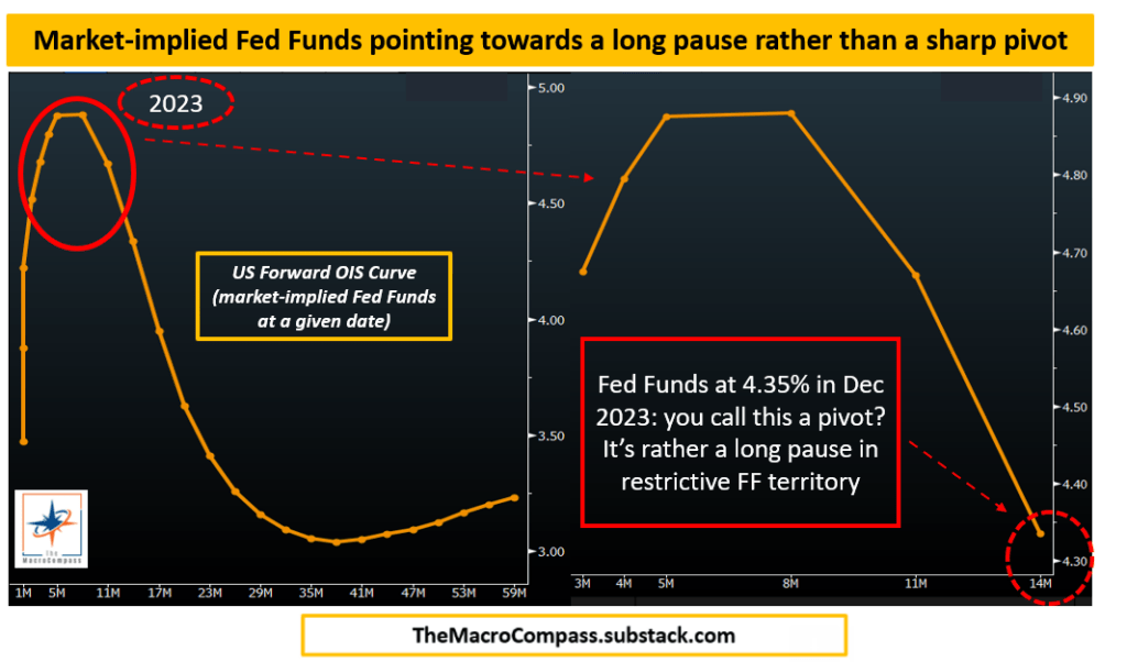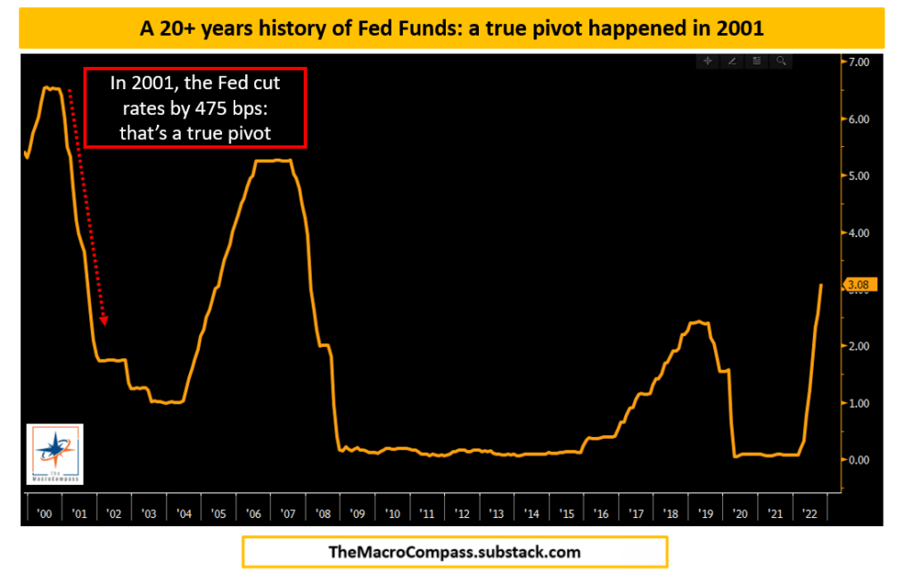 For comparison, if you are looking for a true pivot have a look at 2001 (a historical parallel The Macro Compass models are strongly pointing to for what’s ahead in 2023). Back then, the Fed cut rates by 475 bps (!) in 12 months as earnings and the labor market were materially weakening, and inflation was slowing down too.