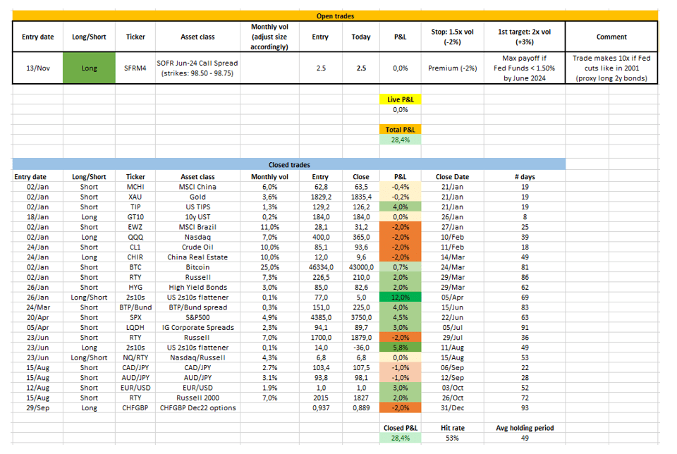 When it comes to Tactical Trades, I am running a tail trade which delivers a positive payoff if the Fed is indeed forced to cut in a similar fashion to 2001 – it’s effectively a proxy-long 2-3y bond trade (proxies: SHY, 2y Treasury futures).