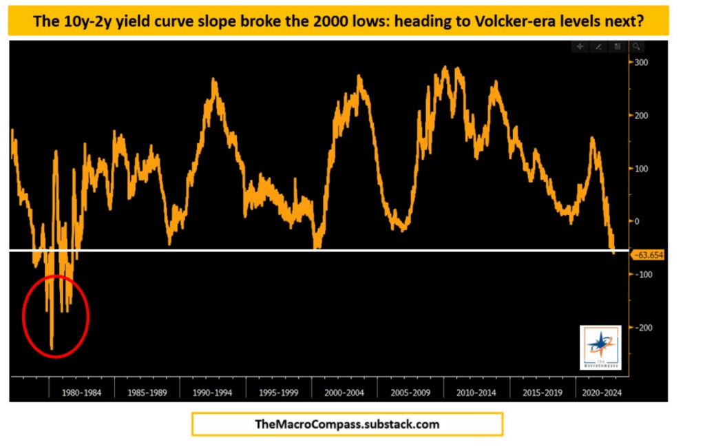 Looking at the big picture though, 2s10s are more inverted than in ’00 and could be heading to Volcker-era inversion levels if the Fed doesn’t really back off.